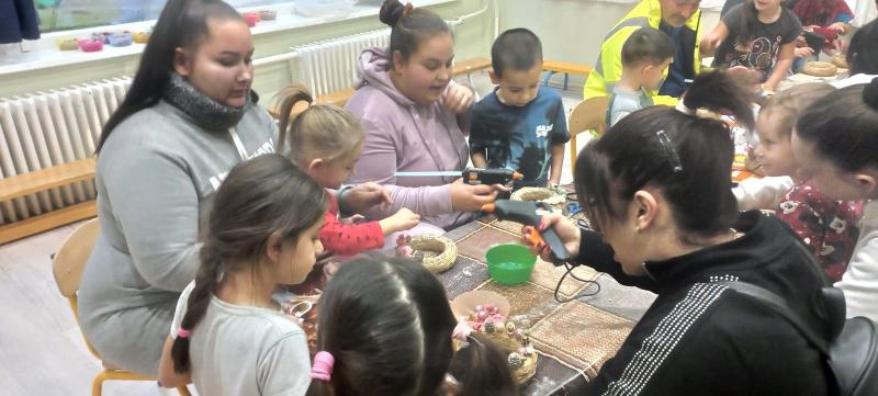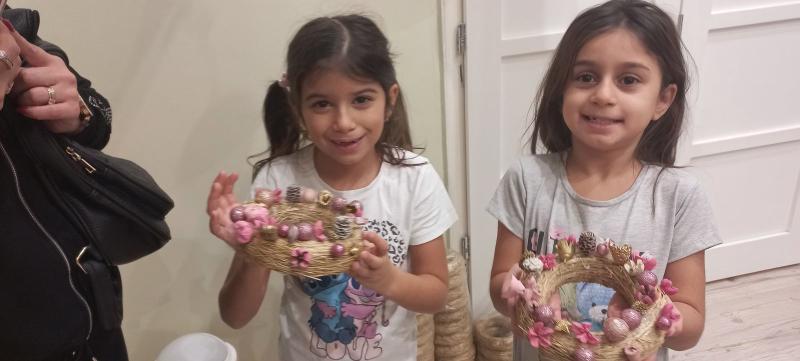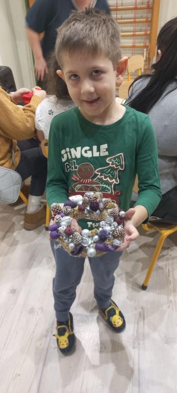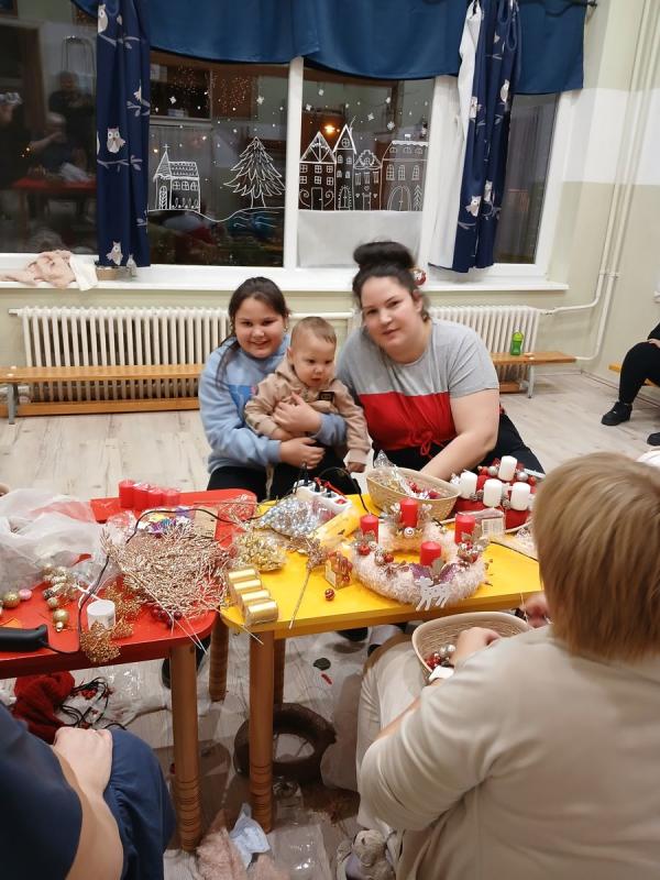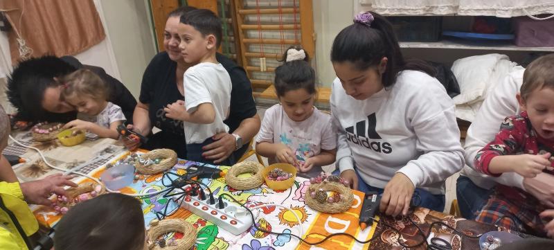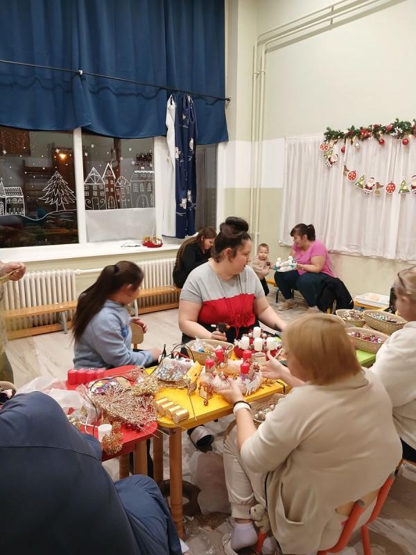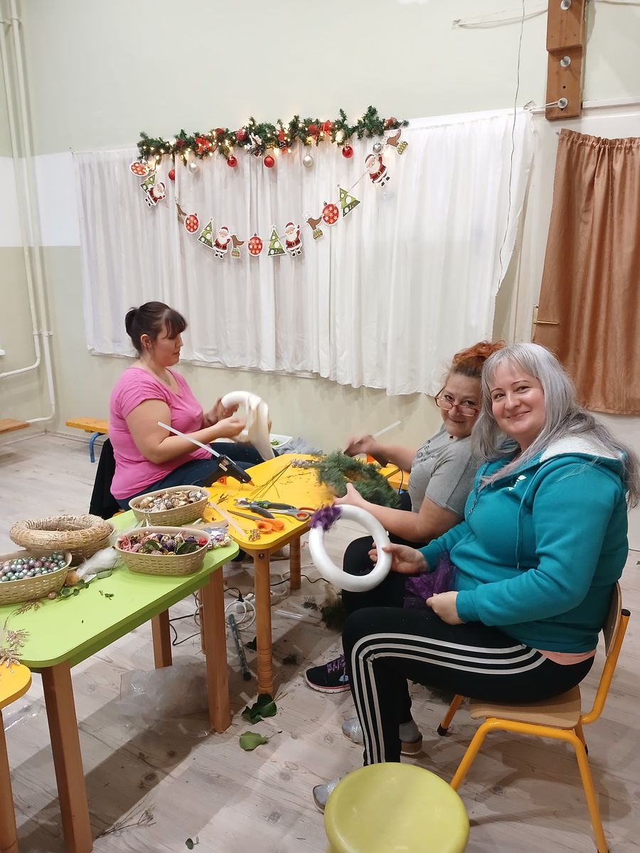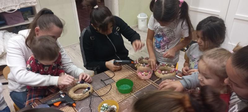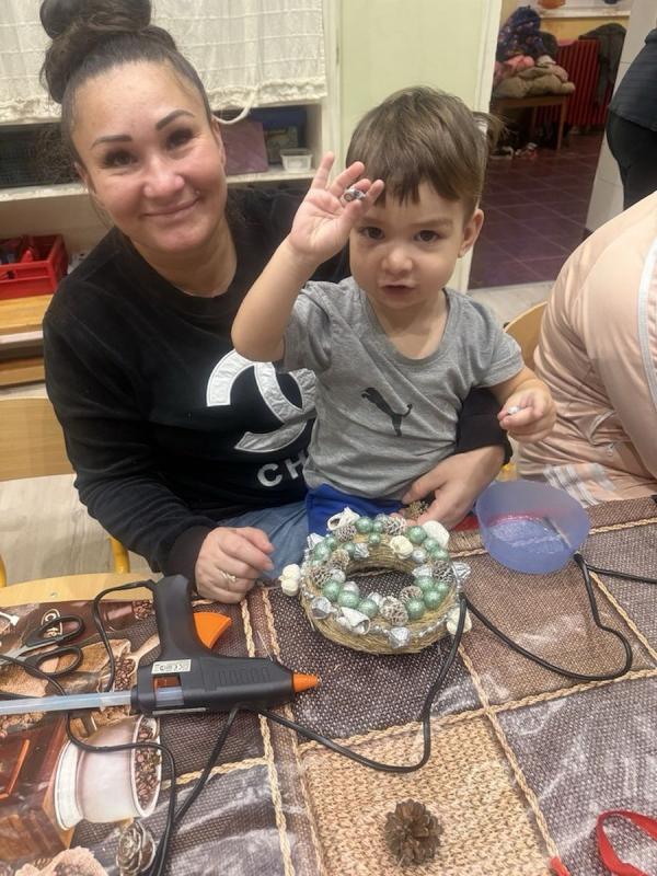 A gyermekek és szüleik együtt munkálkodtak, készültek a szebbnél szebb karácsonyi kopogtatók. Az anyukák és apukák is bizonyították kreativitásukat. A halk tanácskozást követték a próbálgatások, míg eldőlt, hogy mit, hová, és milyen színkombinációkban ragasszanak. A kicsik örömmel mutatták meg az elkészült alkotásokat.