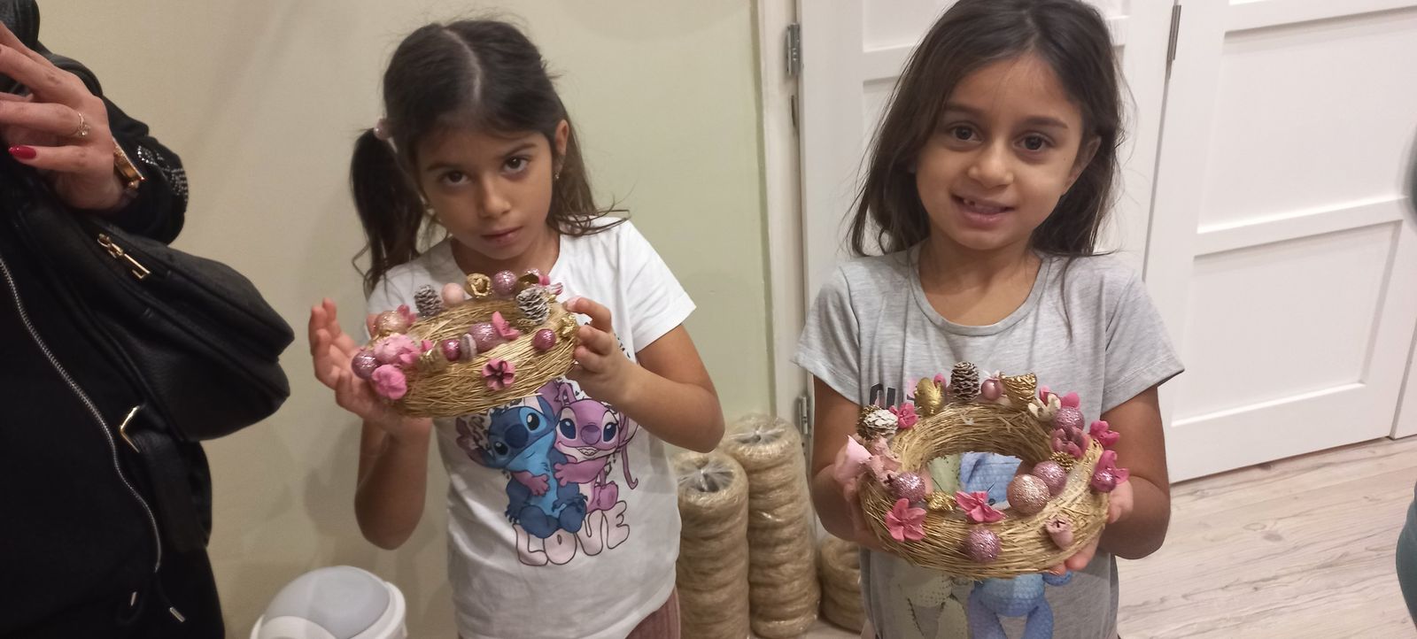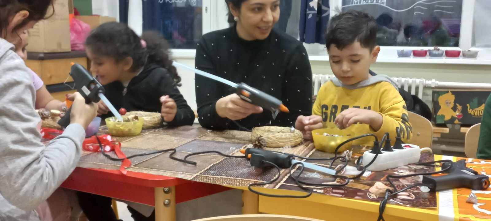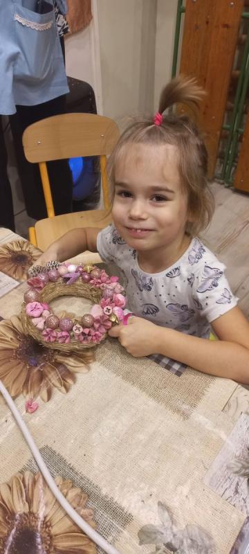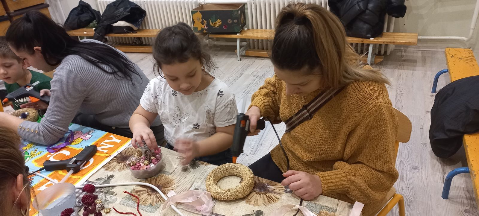 A gyermekek és szüleik együtt munkálkodtak, készültek a szebbnél szebb karácsonyi kopogtatók. Az anyukák és apukák is bizonyították kreativitásukat. A halk tanácskozást követték a próbálgatások, míg eldőlt, hogy mit, hová, és milyen színkombinációkban ragasszanak. A kicsik örömmel mutatták meg az elkészült alkotásokat.