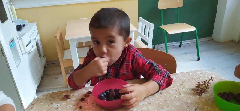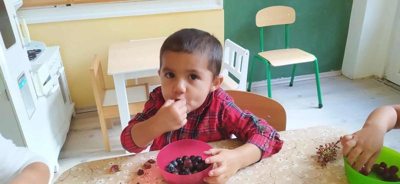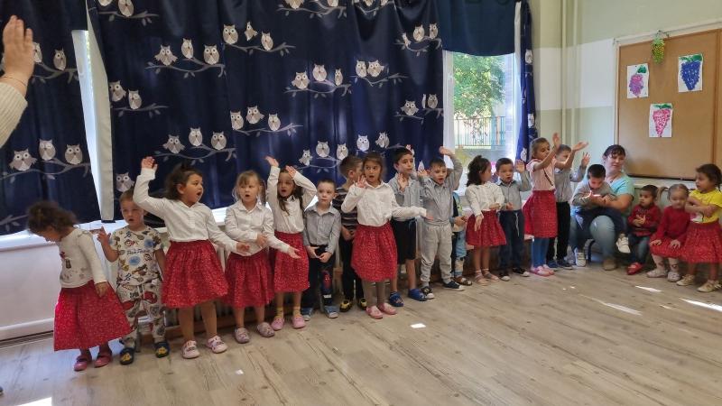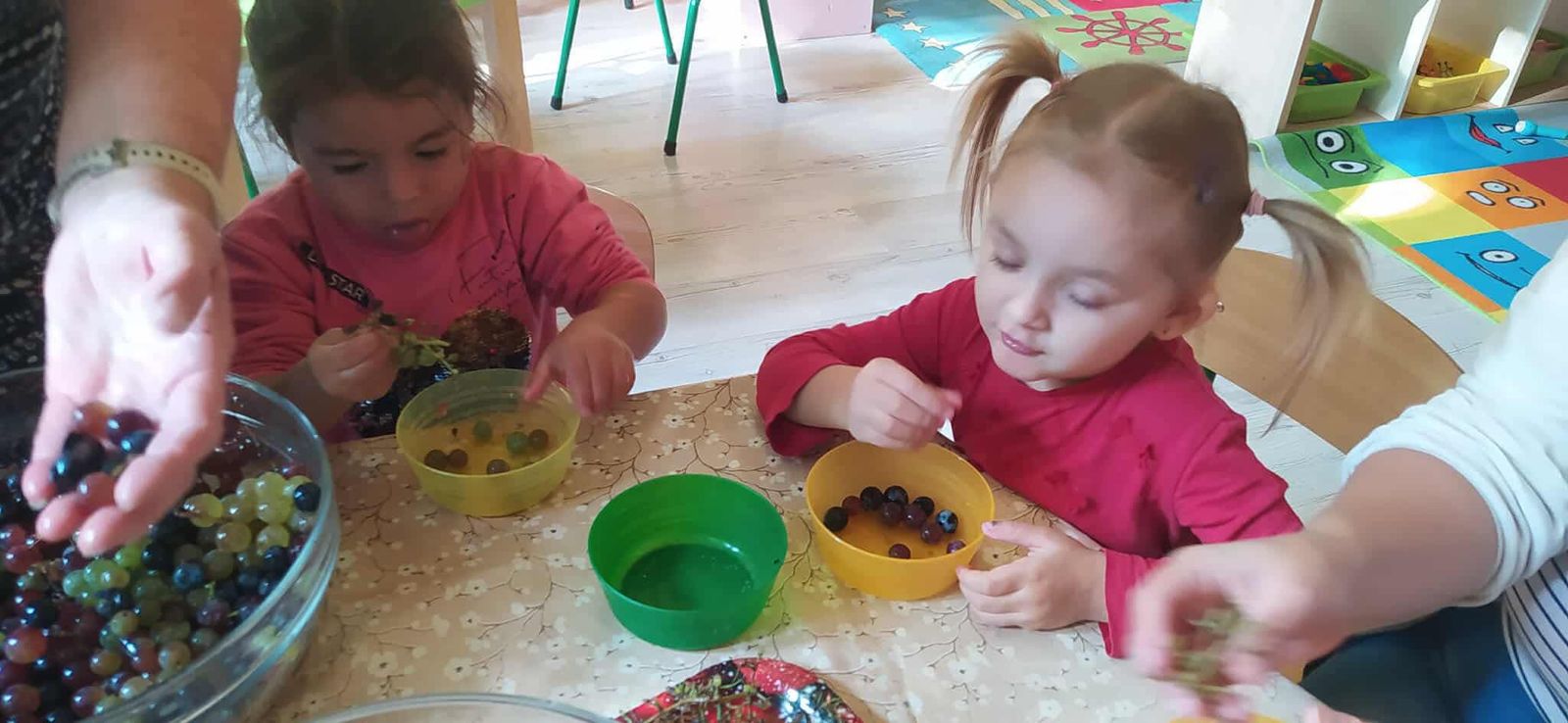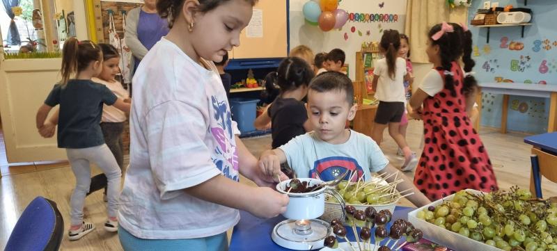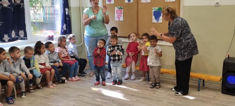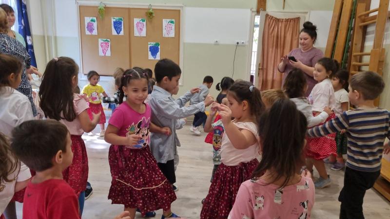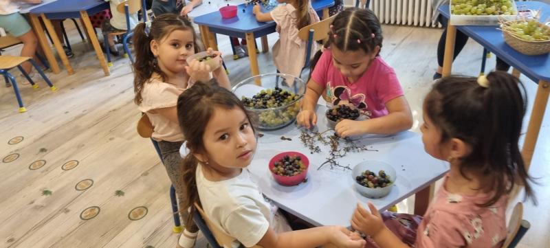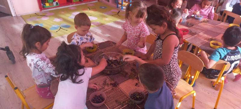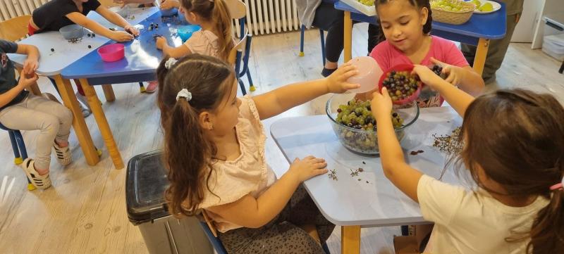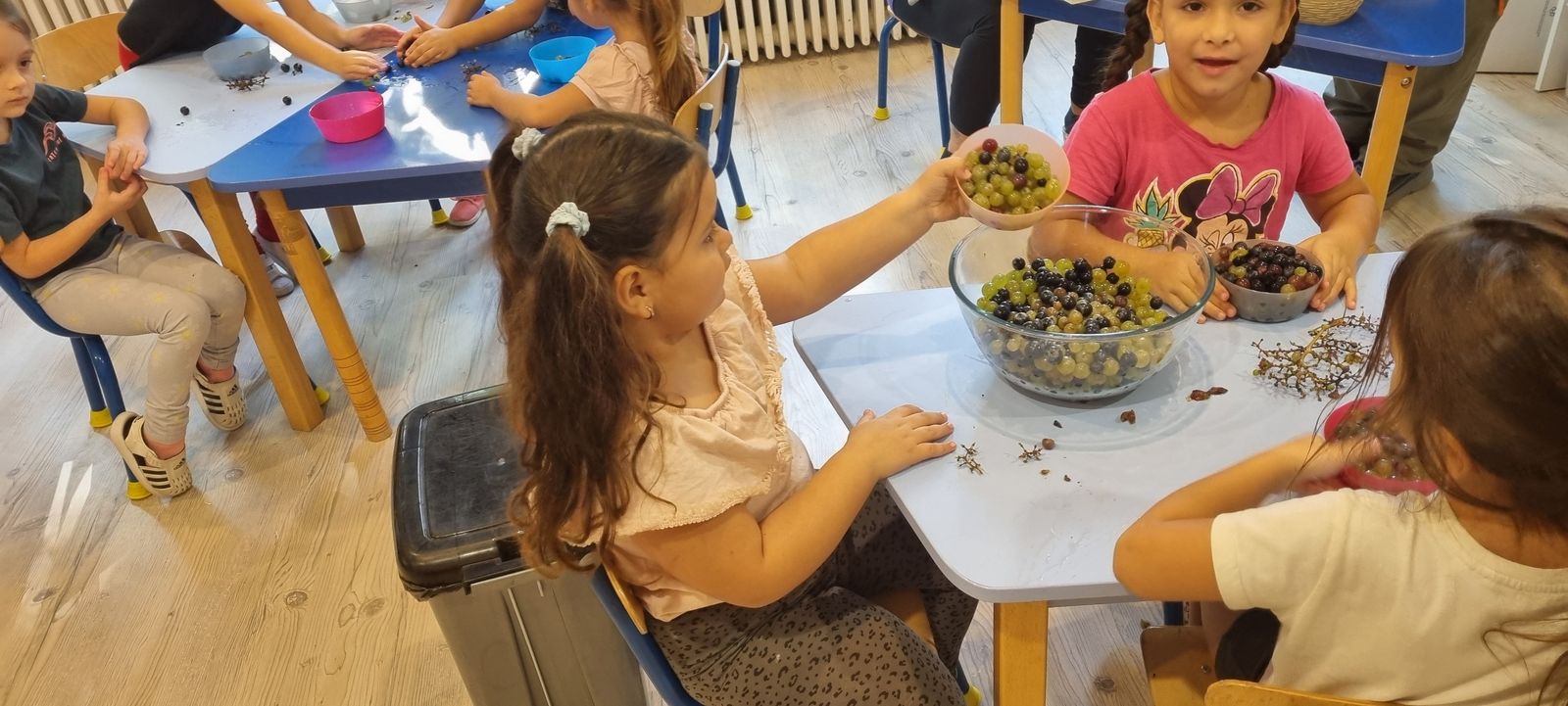 A szülők által hozott szőlőt dadus néni segítségével alaposan megmostuk, majd leszemeztük, és egy nagy tálban gyűjtöttük össze. Eközben őszi verseket szavaltunk, dalokat énekeltünk, s közben nem álltuk meg, hogy ne kóstoljunk bele a fürtökbe, kíváncsian hasonlítva az ízeket, színeket, fürtméretet. Előkerültek a kedvelt szüreti dalos játékok is, mint a „Lipem-lopom a szőlőt” és az „A kállói szőlőbe”.